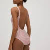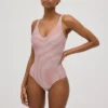 Descubre el bañador espalda abierta estampado de rayas con brillo, diseñado para ayudarte a definir la silueta con un ajuste favorecedor y femenino.