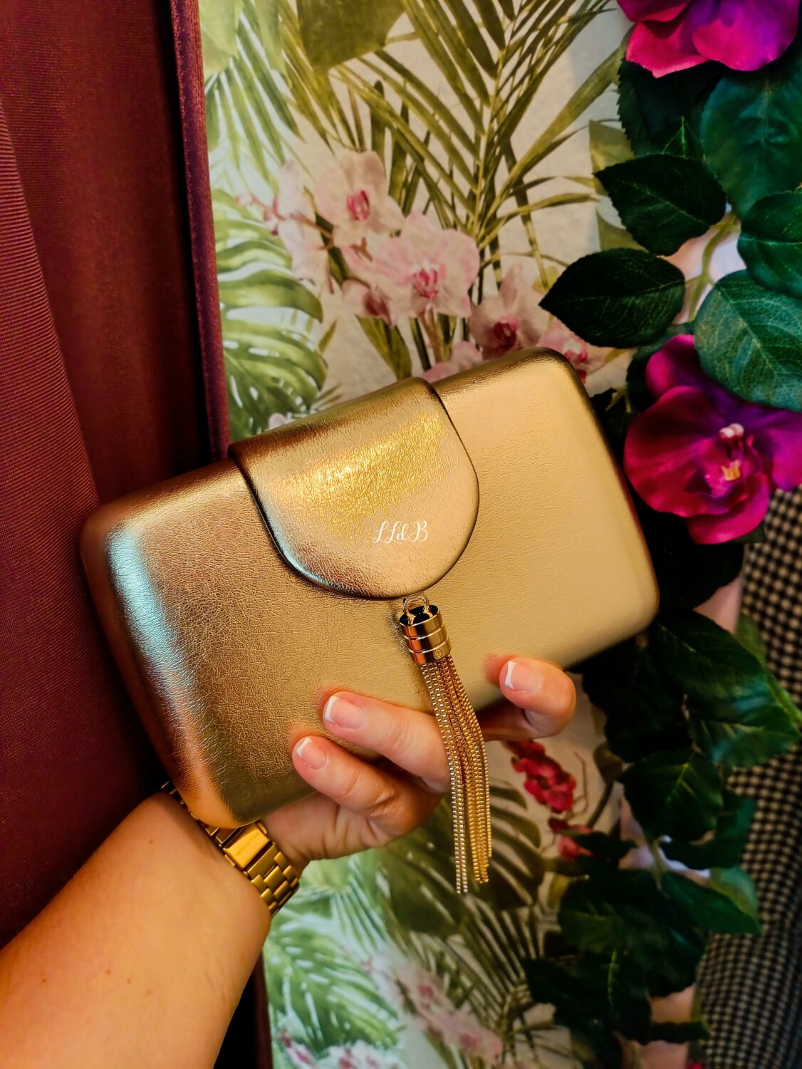 Contiene cadena dorada para llevar en el hombro o cruzado