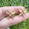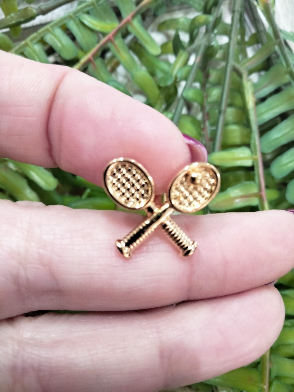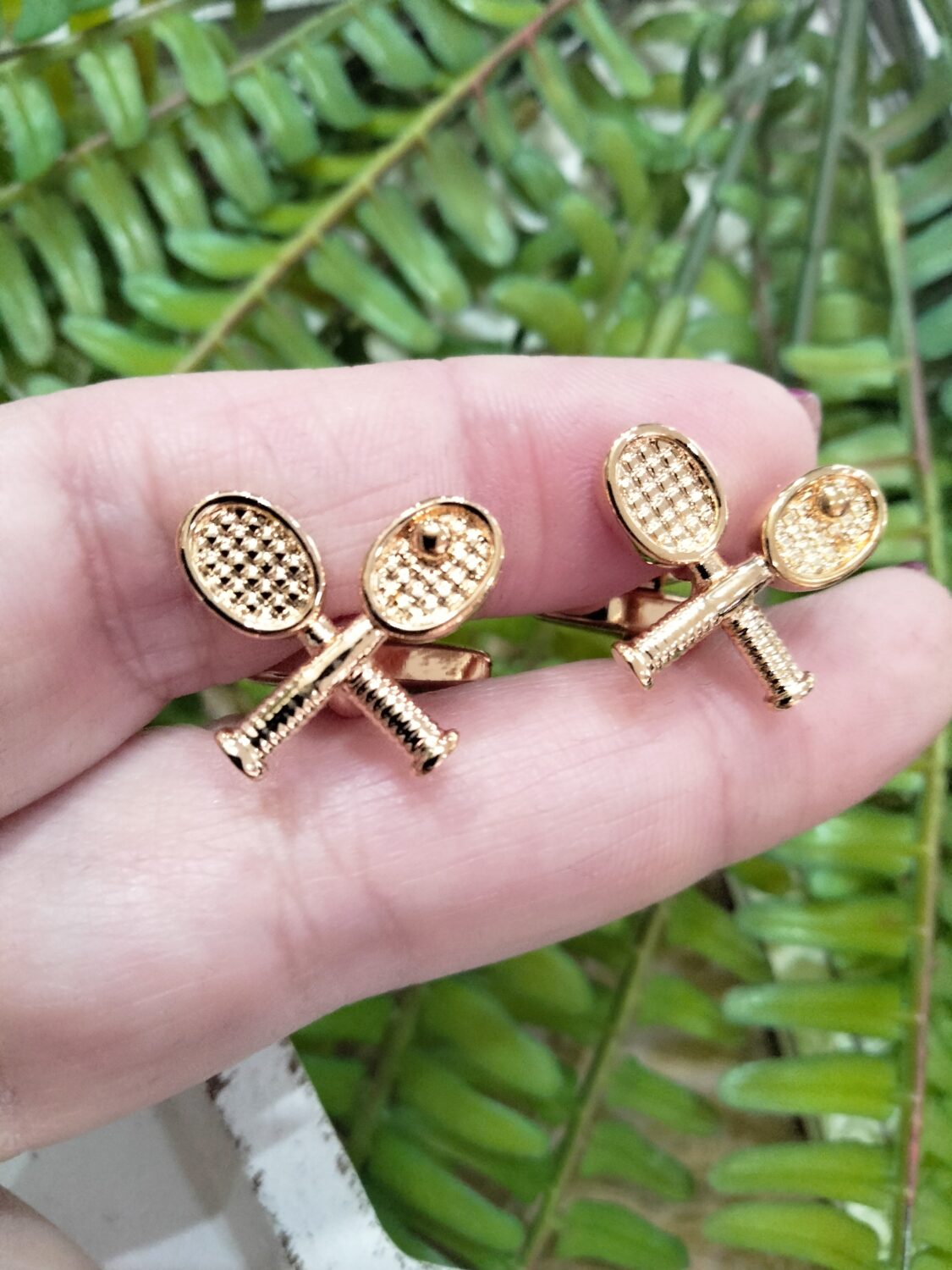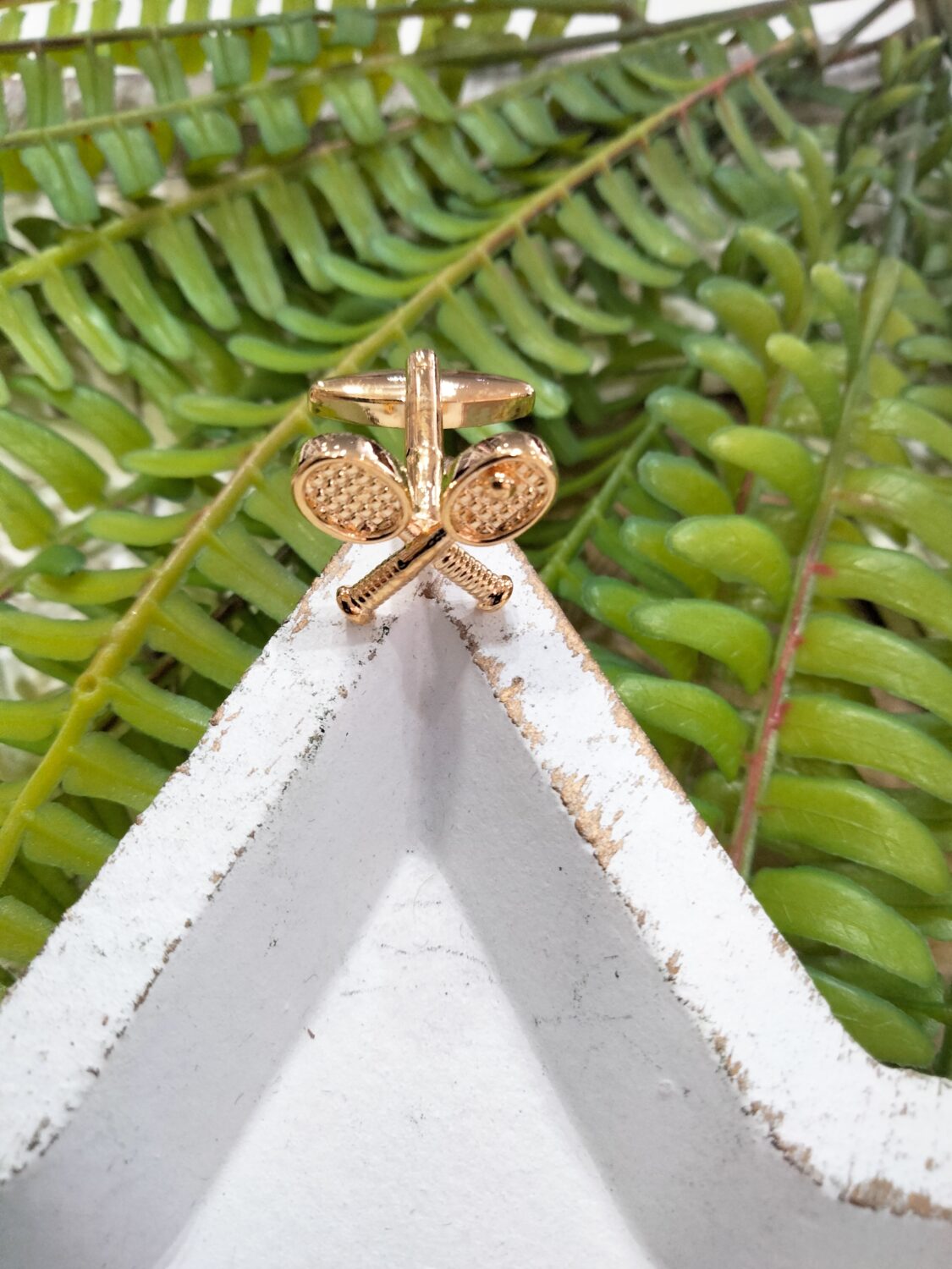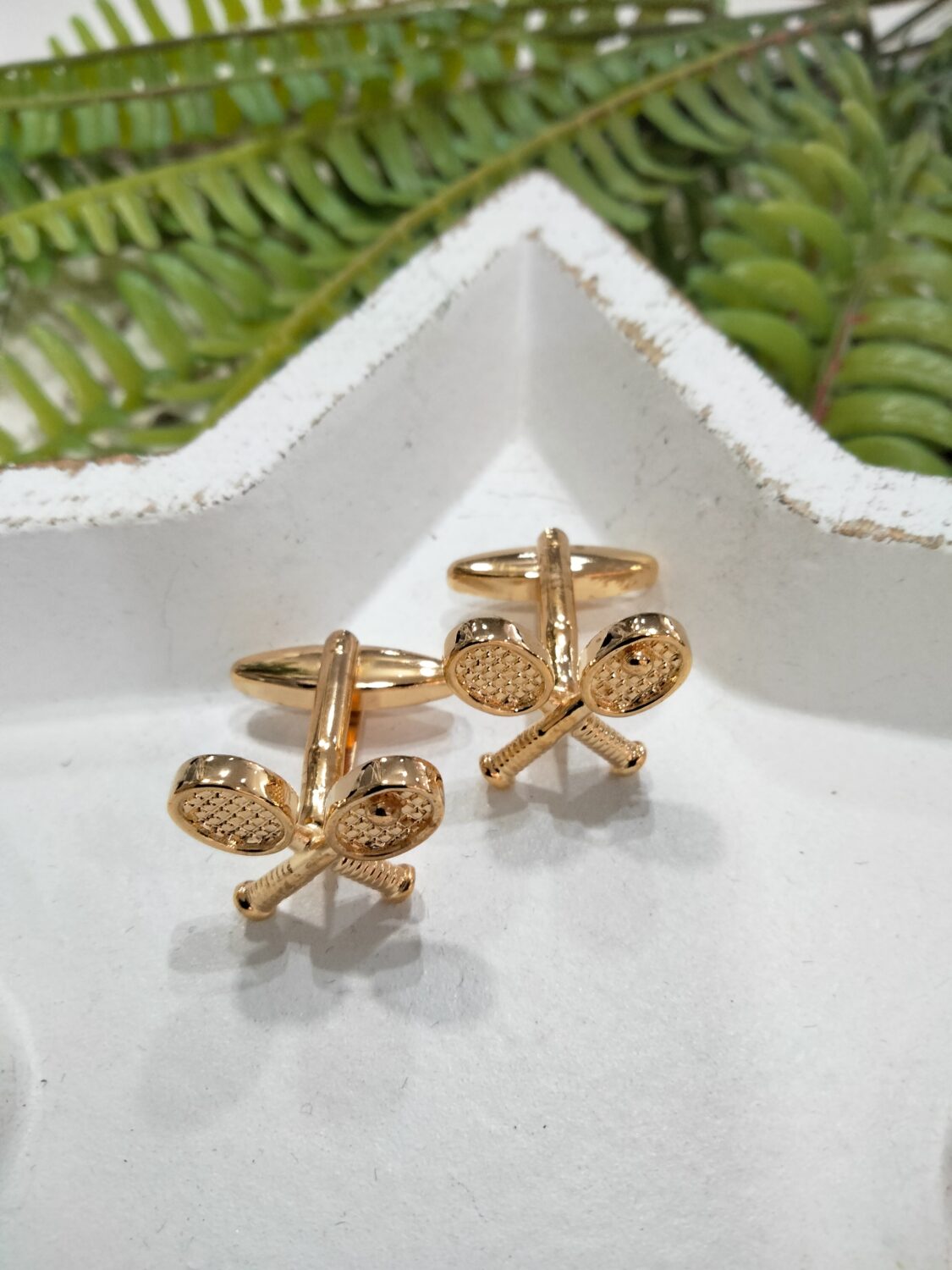 Son unos Gemelos de acero dorados con la figura de unas raquetas de tenis.