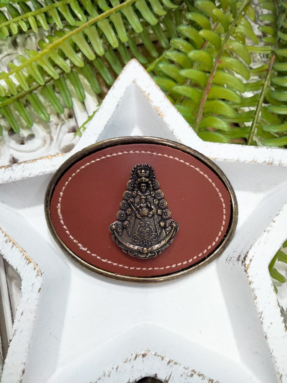 Hebilla para cinturón metálica forma oval. Tiene una base metálica en el reverso que permite ajustarla al cinturón (no incluido).