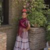 Vestido de flamenca para niña pequeña de color beige con lunares burdeos, de talle alto, manga de farol y bajo de volantes.